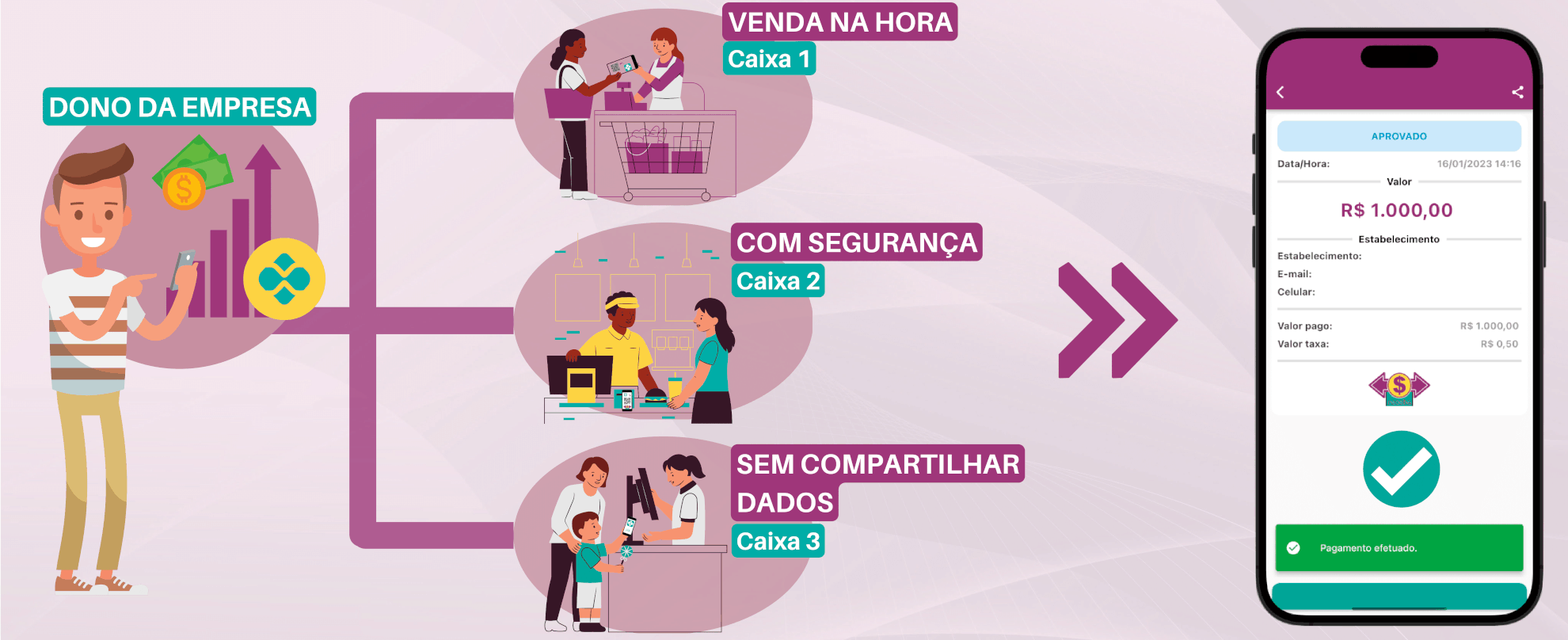 O caixa gera o QrCode de pagamento para o cliente fazer a leitura e pronto! O caixa recebe a confirmação do pagamento com total segurança. Além disso, os registros para o controle e fechamento de caixa ficam registrados no extrato, sem o acesso a sua conta bancária.